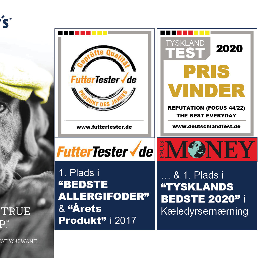 Vores dedikation har ført til flere priser bla.a. som hundefoder bedst i test i 2017, samt Tysklands Bedste indenfor kæledyrsernæring i 2020, 2022 og 2023.